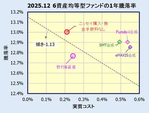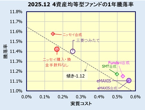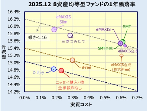 各ファンドの実質コストに対し2025年12月末日時点の1年騰落率をプロットします。