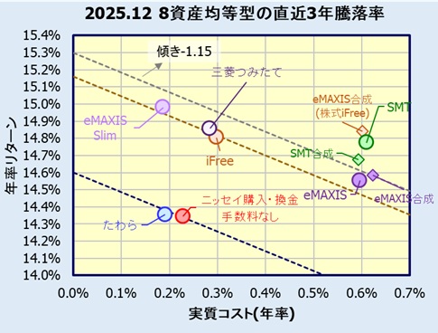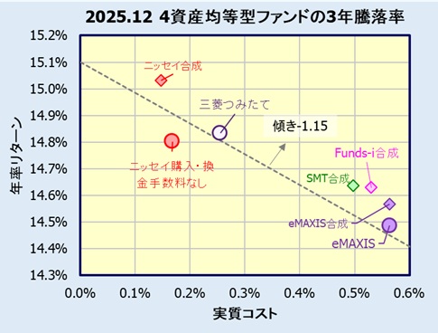 各ファンドの実質コストに対し2025年12月末日時点の3年騰落率(年率)をプロットします。