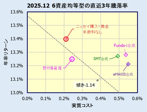 また、eMAXIS、SMT、Funds-iの個別のインデックスファンドを組み合わせて6資産均等型となる合成データを作成し、これとも比較します。