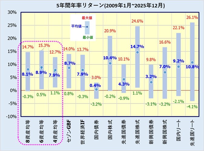 上述の直近の運用成績は、ある特定期間のみの騰落率に大きく左右される事もあり、十分な評価とは言えません。そこで、2009年1月から投資月を1カ月ずつずらしていった複数の5年間リターンの分布を見てみます。全部で144区間のデータとなりますが、その平均値、最大値、最小値をプロットします。(リターンは年率換算)