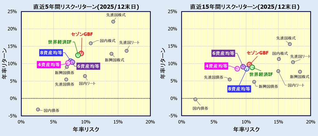 2025年12月末時点の直近5年間、15年間のリターン・リスクを下図にまとめます。
