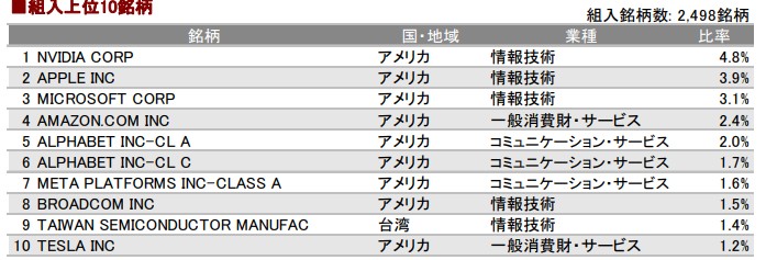 ただ組入比率トップのエヌビディアでさえ4.8%ですので広く分散されている事が分かります。