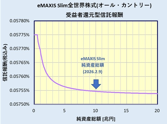 2026年2月9日 純資産総額は10兆円を超え、その時の受益者還元型信託報酬適用後の信託報酬は0.05755%となります。