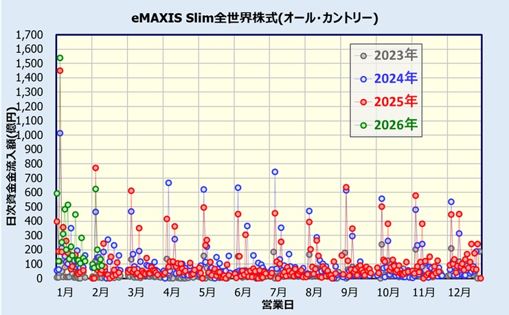 特に2024年1月の3営業日には1日だけで1,014億円、2025年1月の3営業日目は1,450億円、2026年1月の3営業日目は1,539億円と巨額の資金流入、NISAで年初一括投資、または特定口座、旧NISAからの買い替え投資などの影響と推測します。