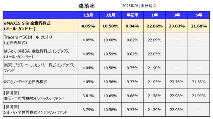 最新の騰落率[利回り](たわらノーロード、Tracers、はじめてのNISA、楽天・オルカンなどと比較) ~2025年9月末日時点~