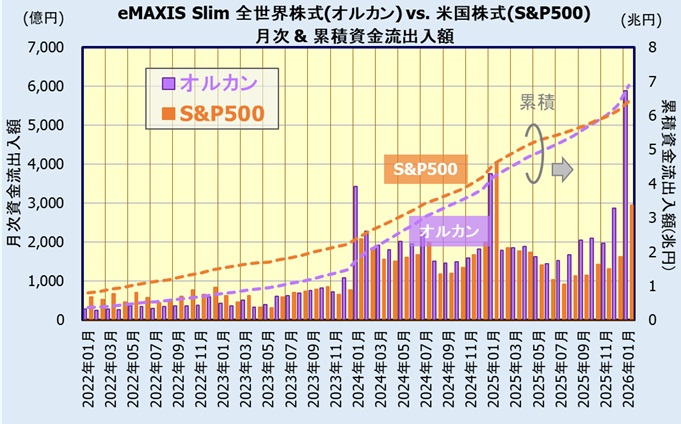 因みに、設定から2026.1までの資金流入額の合計は、米国株式(S&P500)が6.4兆円に対し、全世界株式(オルカン)が6.9兆円と勝っています。