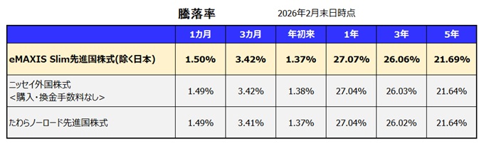 最新の騰落率[利回り](ニッセイ外国株式<購入・換金手数料なし>、たわらノーロードなどと比較) ~2026年1月末日時点~