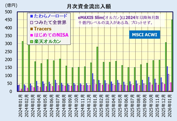はじめてのNISAは、Tracersを上回る流入額になっていますが、たわらノーロード全世界株式、つみたて全世界株式には負けています。