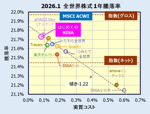 そして、はじめてのNISA・全世界株式インデックス(オール・カントリー)、実質コストではeMAXIS Slim(オルカン)より低く、最安値です。