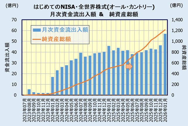 月次資金流出入額からはじめてのNISA・全世界株式インデックス(オール・カントリー)の売れ行き・人気を見てみます。