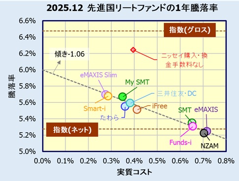 実質コストに対して2025.12末時点の1年騰落率をプロットします。
