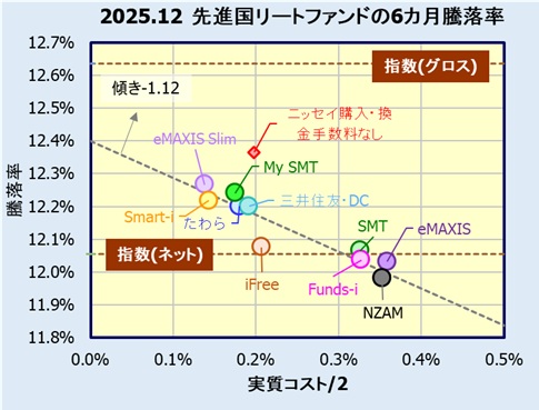 実質コスト(/2)に対して2025.12末時点の6カ月騰落率をプロットします。