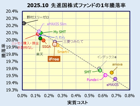 下図は2025年10月末日時点の実質コストに対する1年騰落率を複数のファンドでプロットしたものです。