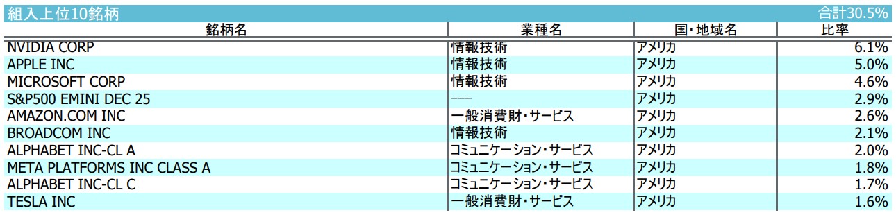 上位10銘柄は全て米国企業で、エヌビディア、アップル、マイクロソフト、アマゾン、ブロードコム、アルファベット(Googleの持ち株会社)など日本でも良く知られた企業が上位になっています。