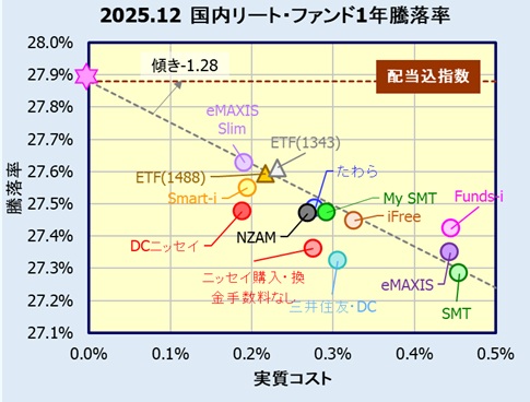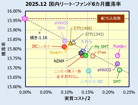 騰落率とコストの関係は、理想的には配当課税を適切に考慮したインデックス(指数)騰落率(これを「真のインデックス」と定義)から決まる傾き、切片の直線になります。国内リートの場合、配当が出ると、それに課税される事無くファンドの資産に入りますので、配当込指数が「真のインデックス騰落率」となります。