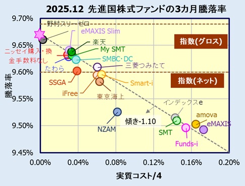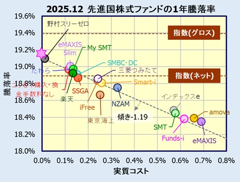 騰落率とコストの関係は、理想的には配当課税を適切に考慮したインデックス(指数)騰落率(これを「真のインデックス」と定義)から決まる傾き、切片の直線になります。ただ、外国株式の場合、「真のインデックス」騰落率がわかりませんので、管理人の主観で図中グレーの点線を引いています。