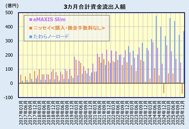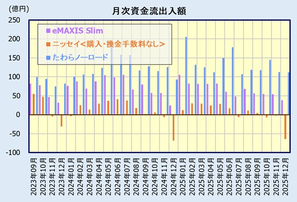 そして、ニッセイ<購入・換金手数料なし>、2023年11月~2024年1月に続き、2024年11~12月、2025年7、10~12月も資金流出に転ずるなど、最近は資金流入額が減少しています。
