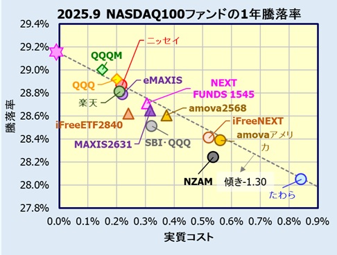 2025年9月末時点の1年騰落率と実質コストの関係です。