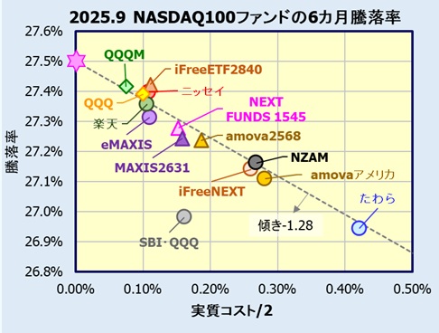 直近のパフォーマンスを評価する為、2025年9月末時点の6カ月騰落率と実質コスト(/2)の関係も示します。
