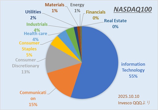 Communicationと合わせて70%、所謂ハイテク企業が多くを占めるのがNASDAQ100の大きな特徴です。