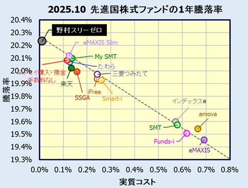 下図は、2025年10月末日時点の実質コストに対する1年騰落率を複数のファンドでプロットしたものです。