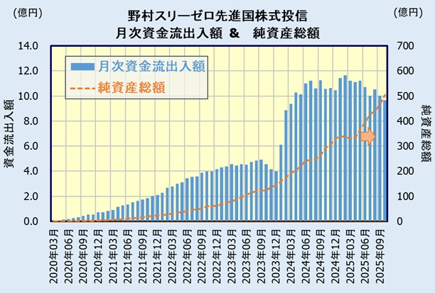 月次資金流出入額、純資産総額から野村スリーゼロ先進国株式投信の売れ行き・人気を見てみます。