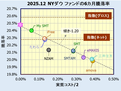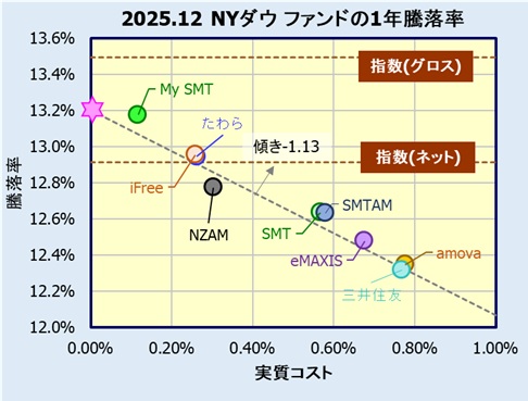 2025.12末日時点の1年騰落率と実質コストの関係を見てみます。