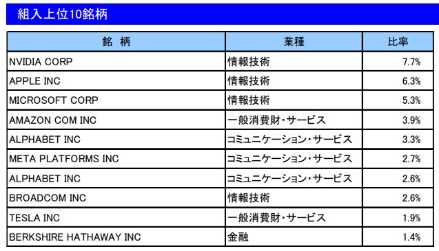 楽天・プラス・S&P500インデックス・ファンドの月次レポート2026.1の組入上位10銘柄です。
