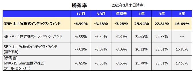 最新の騰落率[利回り] [SBI・全世界株式、eMAXIS Slim全世界株式(オール・カントリー)との比較]~2026年3月末日時点~