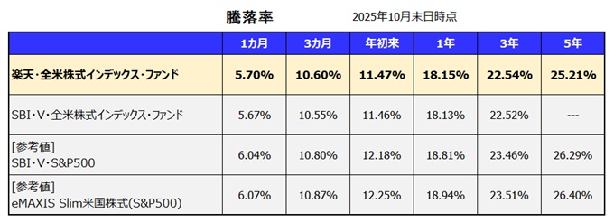 最新の騰落率[利回り] [SBI・V・全米株式/S&P500、eMAXIS Slim米国株式(S&P500)との比較] ~2025年10月末日時点~