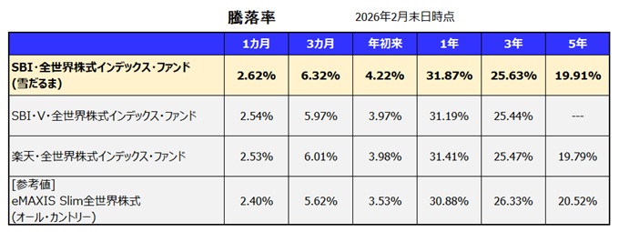 最新の騰落率[利回り](楽天・VT/SBI・Vと比較) ~2026年2月末日時点~