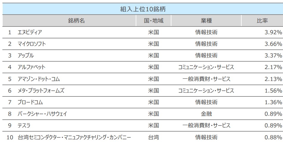 ただ組入比率トップのエヌビディアでさえ3.9%ですので、広く分散されている事が分かります。