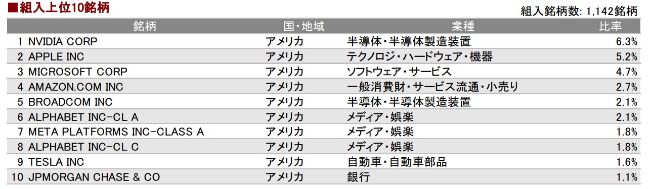上位10銘柄を全て米国が占めており、NVIDIA、アップル、マイクロソフト、アマゾン、ブロードコム、アルファベット(Googleの持ち株会社)など日本でも良く知られた企業が上位になっています。