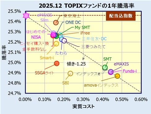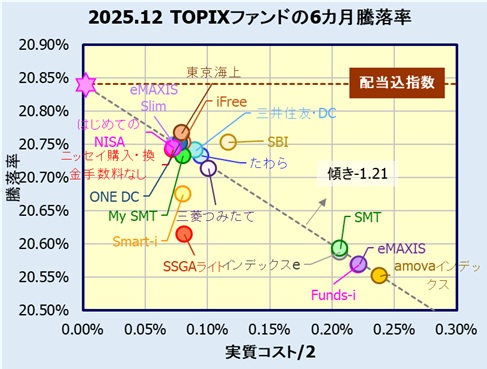 騰落率とコストの関係は、理想的には配当課税を適切に考慮したインデックス(指数)騰落率(これを「真のインデックス」と定義)から決まる傾き、切片の直線になります。国内株式の場合、配当が出ると、それに課税される事無くファンドの資産に入りますので、配当込指数が「真のインデックス騰落率」となります。