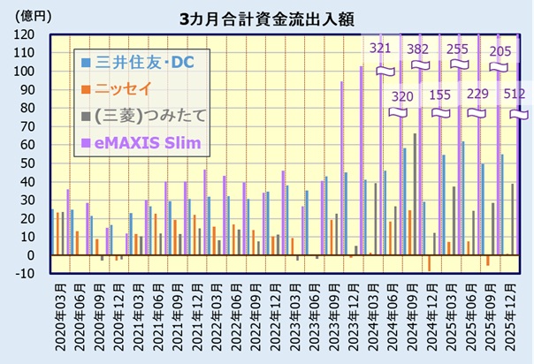 2025年下半期1~3位のeMAXIS Slim、三井住友・DCつみたてNISA、つみたて日本株式(TOPIX)、15位のニッセイ<購入・換金手数料なし>、この4本の資金流出入額の推移を見てみます。