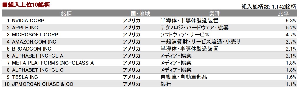 上位10銘柄全てを米国が占めており、エヌビディア、アップル、マイクロソフト、アマゾン、ブロードコム、アルファベット(Googleの持ち株会社)など日本でも良く知られた企業が上位になっています。
