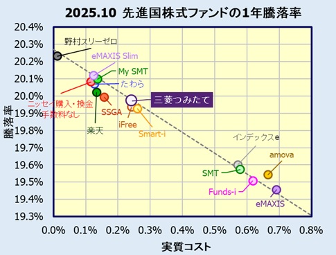 下図は2025年10月末日時点の実質コストに対する1年騰落率を複数のファンドでプロットしたものです。