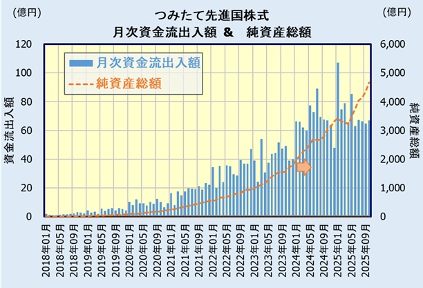 つみたてNISAが開始された2018年から売れ始め、2019年は毎月3~6億円、2020年は10億前後、2021年は10~20億円、2022~2023年は30億を超える月があるなど順調に資金流入が増えており、新NISAが始まった2024年以降は50~110億円(/月)と比較的売れているファンドです。