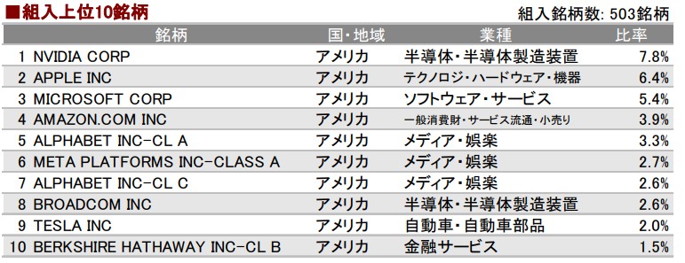 保有する銘柄数は503(2026.1末時点)で、S&P500を構成するほぼ全ての銘柄を保有しています。
