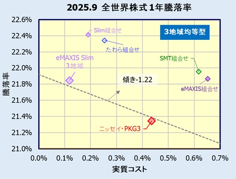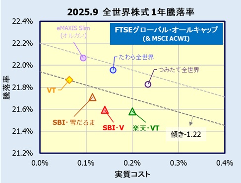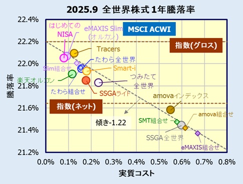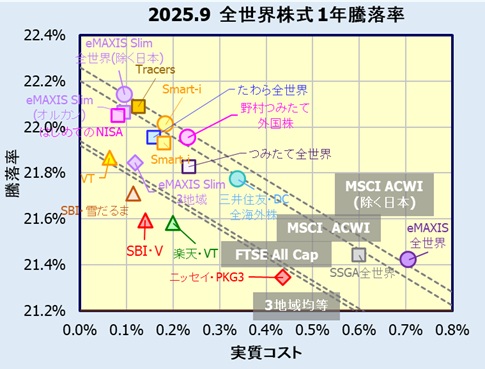 2025年9月末日時点の1年騰落率です。(参考までにMSCI ACWIとの連動を目指すファンドもプロット)