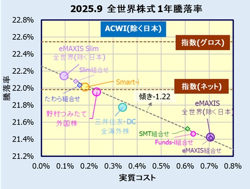 MSCI ACWI(除く日本)をベンチマークとするファンドだけでプロットしてみます。