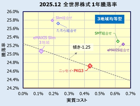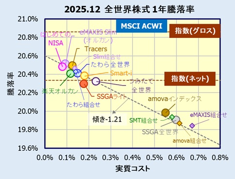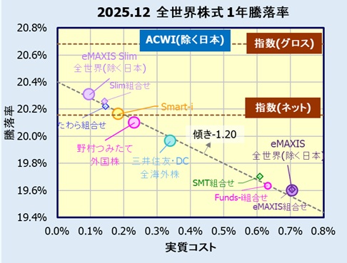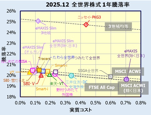 2025年12月末日時点の1年騰落率です。(参考までにMSCI ACWIとの連動を目指すファンドもプロット)